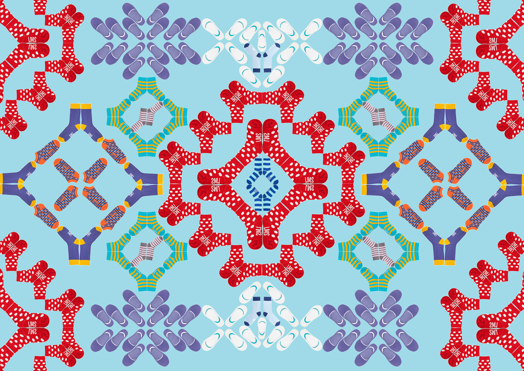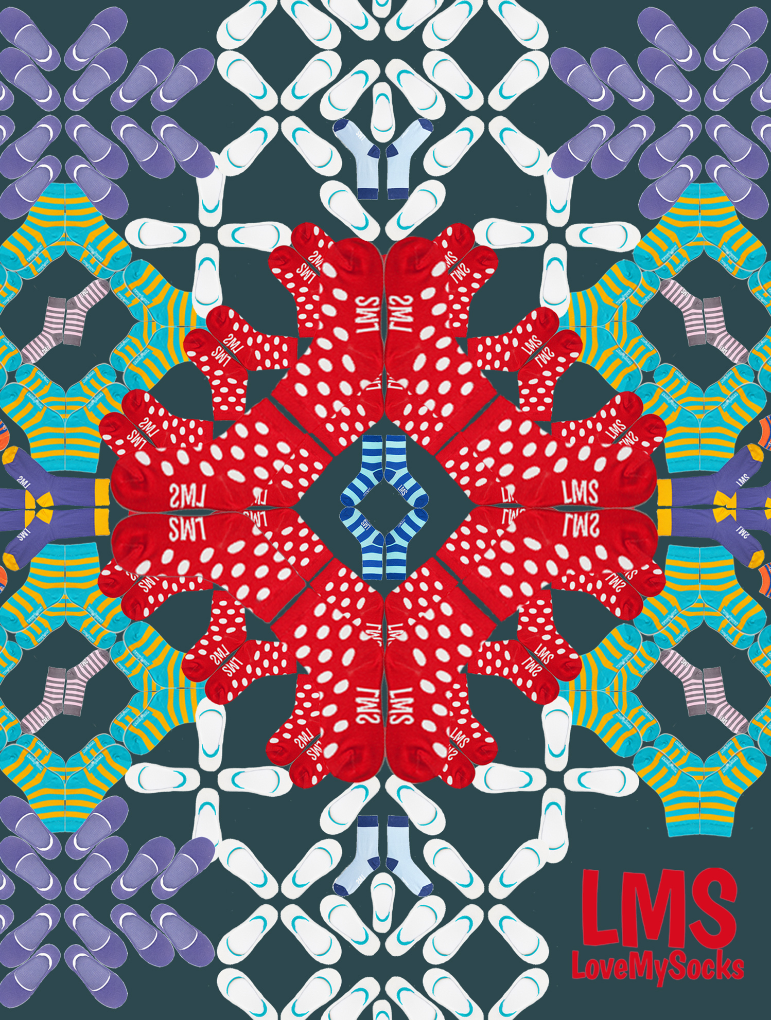 I began by exploring different ornamental ideas and decided on a kaleidoscope-like pattern. I designed the final poster first, treating the socks as graphic elements rather than individual products. This allowed me to establish composition, rhythm, and visual hierarchy before moving to motion.