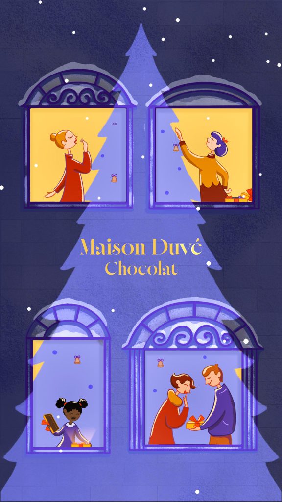 Maison Duvé Chocolat is inspired by real artisan chocolate makers who take pride in their craftsmanship. They want to stand out with an ad that attracts chocolate lovers who appreciate aesthetically pleasing, entertaining content with a cozy atmosphere of the winter holidays. The campaign would also aim to communicate the brand’s values of artistry, creativity, charming playfulness, and of course a handcrafted quality.
